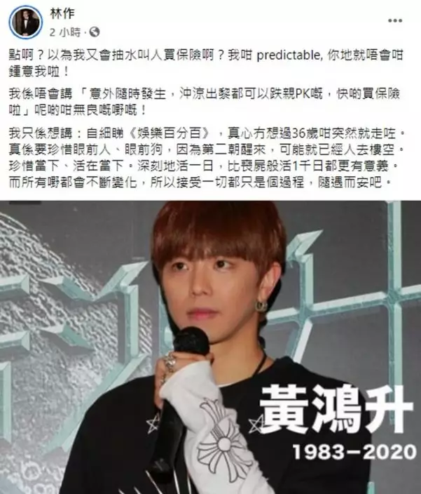 2020年9月台灣藝人「小鬼」黃鴻升猝逝,林作發文籲珍惜眼前人及活在當下,並聲稱不是抽水,但繼續惹網民負評。