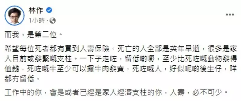 2022年底10月底,南韓首爾梨泰院發生人踩人悲劇,林作轉發相關報道並力Sell人壽保險。