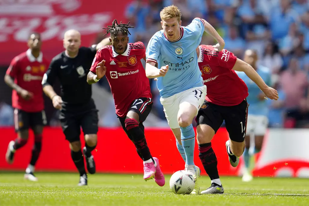 曼城開賽12秒閃電式打開紀錄,曼城門將奧迪將球踢前,迪布尼二傳給根度籣,他在禁區邊窩利抽入,曼聯門將迪基亞目送皮球入網,這個入球亦創下足總盃最快入球紀錄。曼城入球後繼續控制比賽,踢至33分鐘,加利殊回防時在禁區內犯手球,球證查看 VAR判十二碼,由費奴費蘭迪斯操刀入網,曼聯追成 1:1 ,半場雙方踢成平手。
