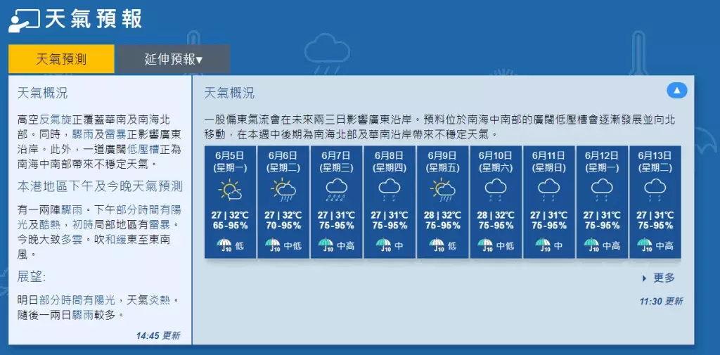 天文台預料5日部分時間有陽光,天氣炎熱,最高氣溫約32度,一股偏東氣流會在未來兩三日影響廣東沿岸。預料位於南海中南部的廣闊低壓槽會逐漸發展並向北移動,在本週中後期為南海北部及華南沿岸帶來不穩定天氣。