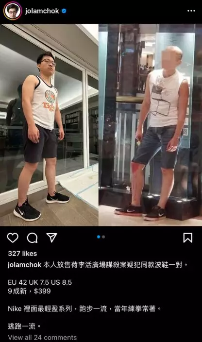林作(左)模仿荷里活廣場兇案疑犯的裝束並穿上同款波鞋,表示可以出售。