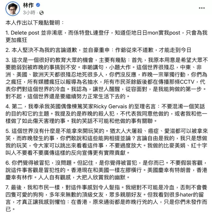 林作事後再發聲明,重申「Delete Post並非淆底」,更強調:「 本人堅決不為我的言論道歉,並自豪重申:作爺從來不道歉,才能走到今日。」