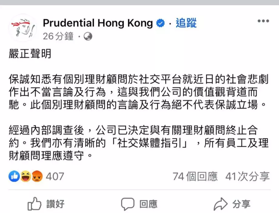 林作表示不同意「前公司」講法,並表示保留所有法律權利。林作指過往已經多次不同程度抽水,當時並未指違反「社交媒體守則」,認為今次事件值得商確。林作道:「話同公司背道而馳,咁嘅罵名,我認為恕不能接受!呢個係公司不尋常舉動,我作為一個無名小卒都要保護自己。話我價值觀同公司背道而馳,係好嚴重嘅指控,嚴重影響我將來嘅工作可能性。」