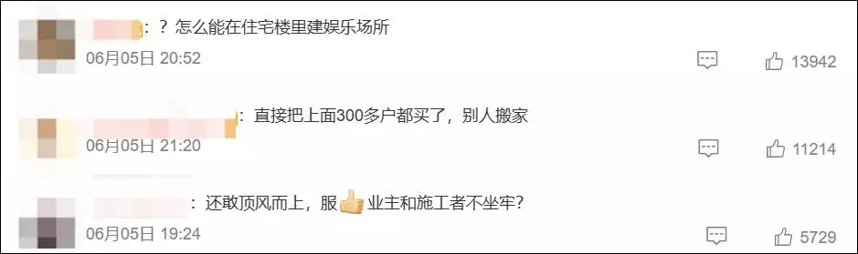 事件曝光後,馬上衝上了熱搜,引發網民關注。有網民表示憤怒:「怎麼能在住宅樓裡間娛樂場所?」,也有人表示哈爾濱砸承重牆事件沒過多久,還敢頂風而上。還有人質疑涉事者「是怎麼購得42套房產的」?、「關鍵是住宅變成營業性KTV,這能通過審批?」也有人向物業公司問責:「物業是幫兇,應該也是未來的賠償方,賠得痛了,才知道履行管理責任。」