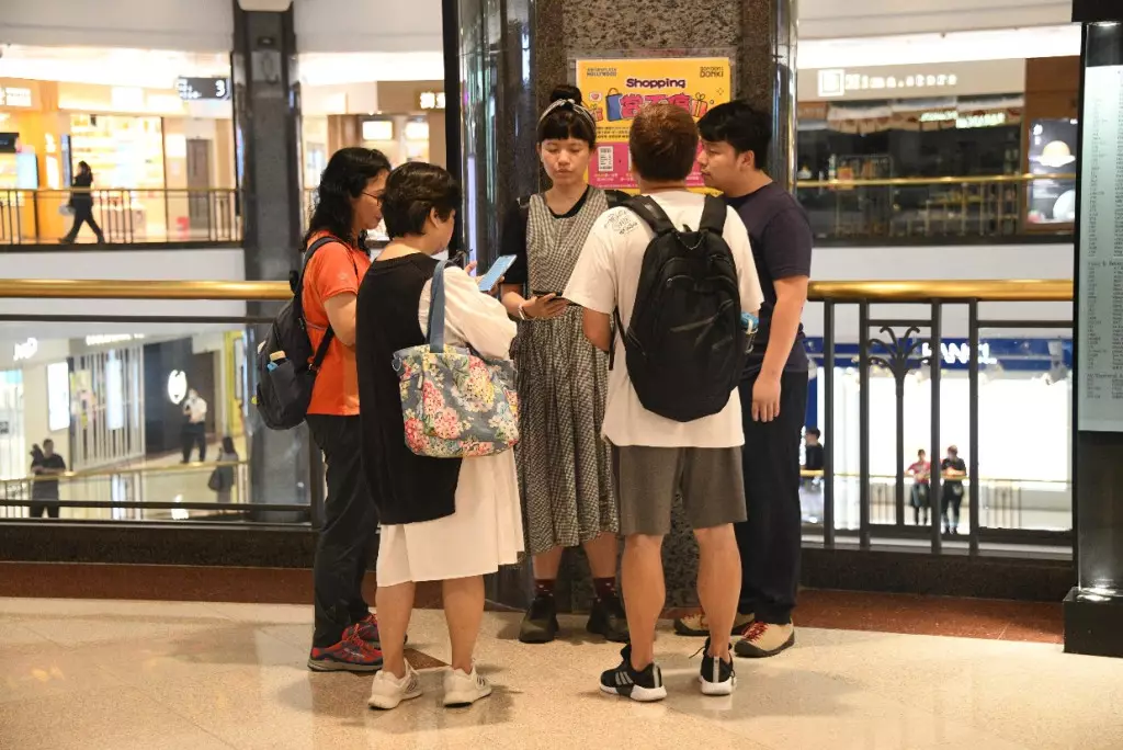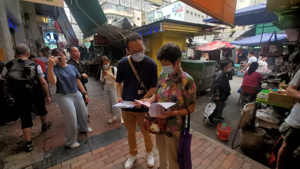 香港國際社會服務社的社工在街頭派單張,教市民處理危機事件後的壓力。