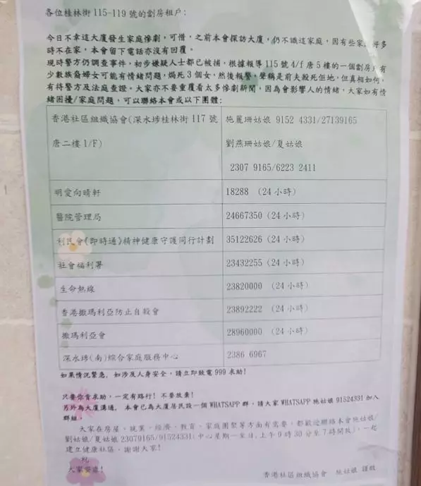 警方今晨繼續在兇案單位調查,SOCO貼通告籲遇事者求助。