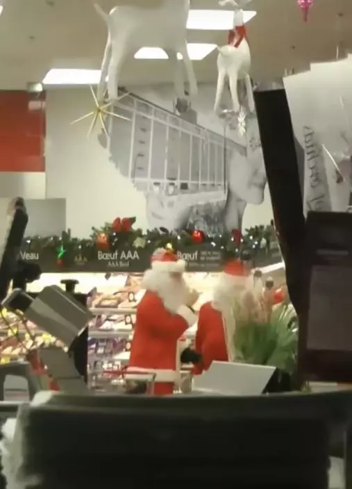 數名男子扮聖誕老人闖超市搶食品分發予貧困人士以此抗議物價飆升。影片截圖