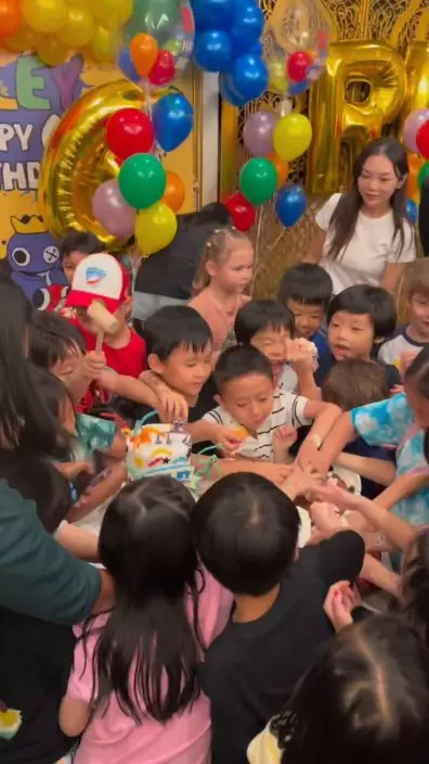 短片見到孫慧雪在奢華場地為囝囝提早舉行生日會,一家三口還着上《Rainbow Friends》的T恤,正在陀B的孫慧雪着上紫色Tee,反而有幾分似「滑嘟嘟」。生日現場有不少美食外,還設有大型吹氣滑梯,有魔術師表演、有人扭氣球、畫人體彩繪,數十名小朋友都玩得相當盡興。Riley在切蛋糕前,還用咪呼喊:「全部人過嚟。」所有小朋友蜂擁而至一齊切蛋糕,勁有霸氣。