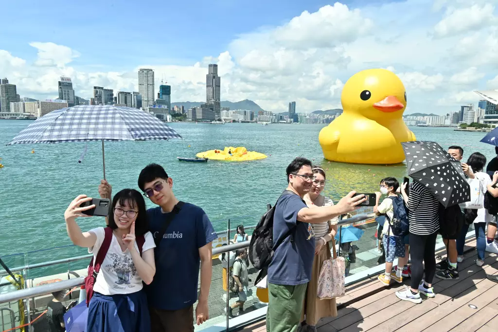 巨型黃色「橡皮鴨」於中環海濱供市民參觀。