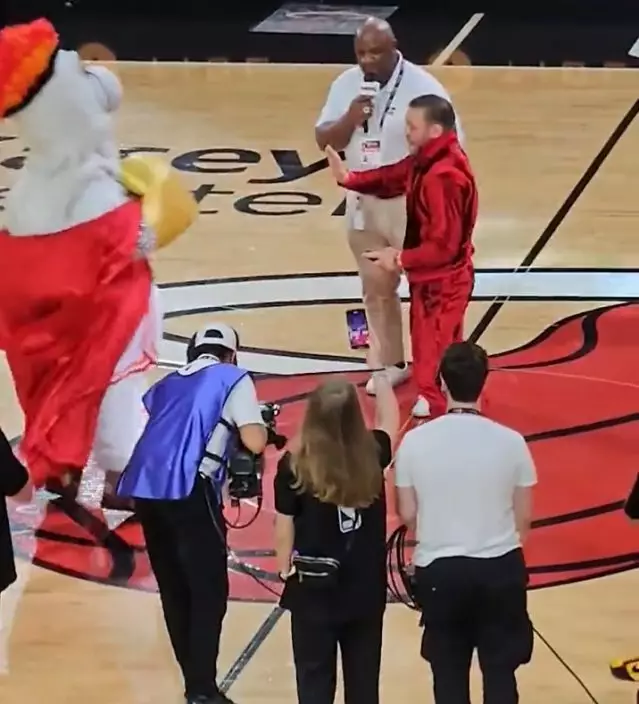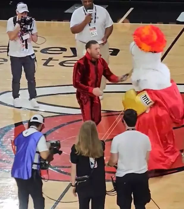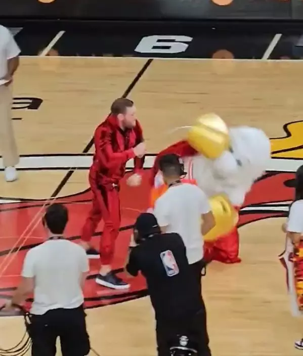 熱火吉祥物Burnie在半場時,跟MMA拳手麥佳格一同進入球場,熱火吉祥物戴上拳套卻立即中了麥佳格一記左勾拳後,隨即倒地,倒地後再被麥佳格補多一拳,「表情」非常痛苦,需要由工作人員拖離球場,全場球迷更大喝倒采。