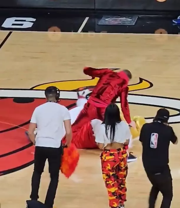 熱火吉祥物Burnie倒地後再被麥佳格補多一拳,「表情」非常痛苦。網上圖片