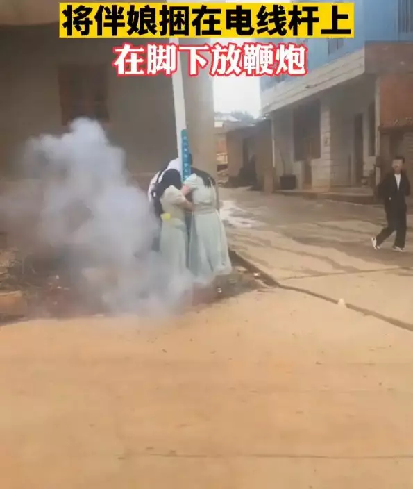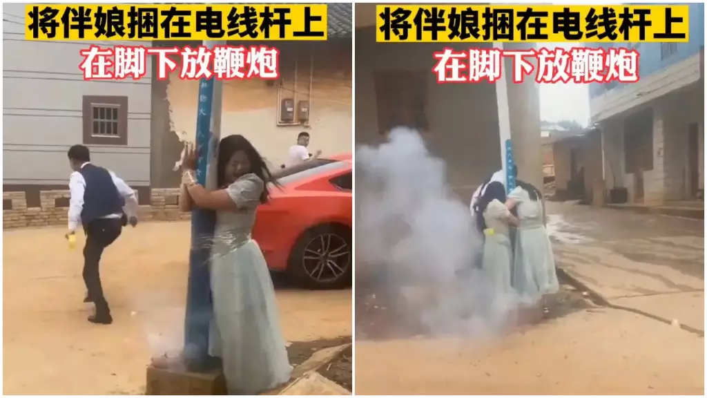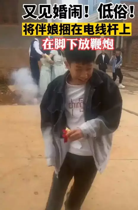 據查,這段視頻拍攝於6月9日,畫面中一位伴娘被伴郎綁在電線桿上,用透明膠帶綁住雙手,其他人又用膠帶纏繞了好幾圈,最後又在她腳下點燃鞭炮。另一段視頻中則是兩位伴娘被綁在電線桿上,一男子點燃鞭炮後扔到伴娘腳下,情急之下伴娘還爆了粗口。