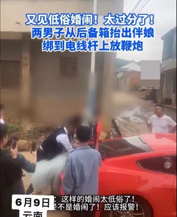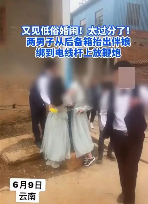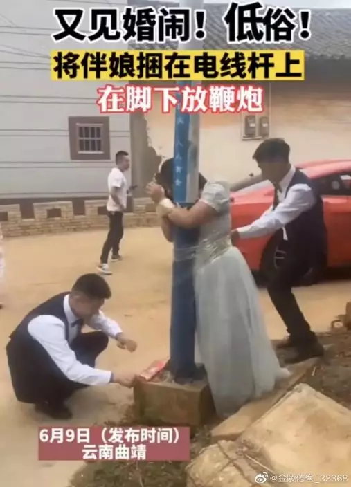 傳雲南一婚禮上伴娘被綁電杆扔鞭炮 網友:婚閙惡俗欺人太甚