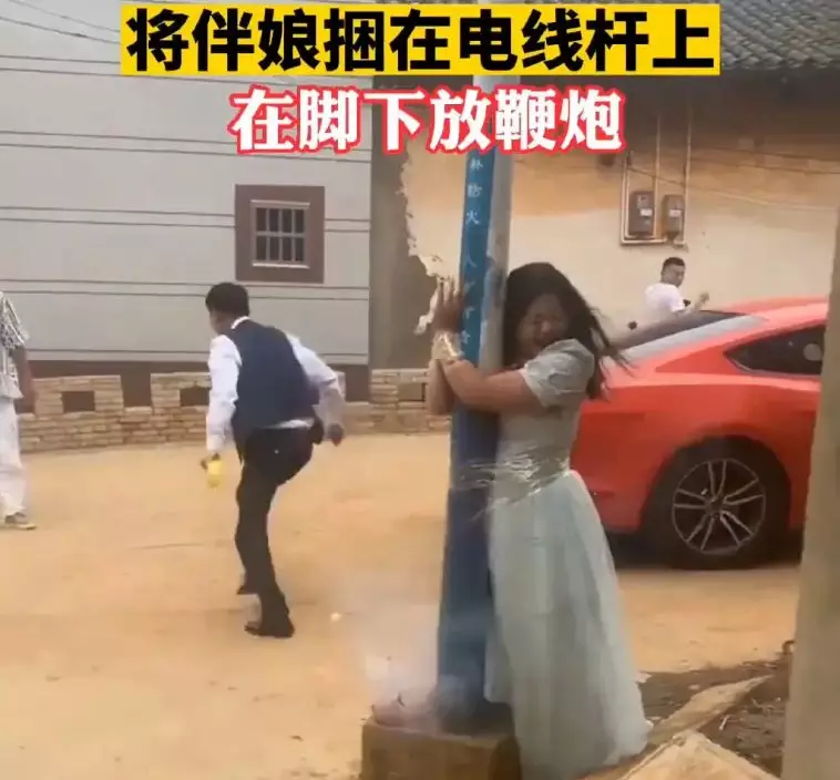 伴娘被伴郎綁雷電線桿上,腳下再被點鞭炮。