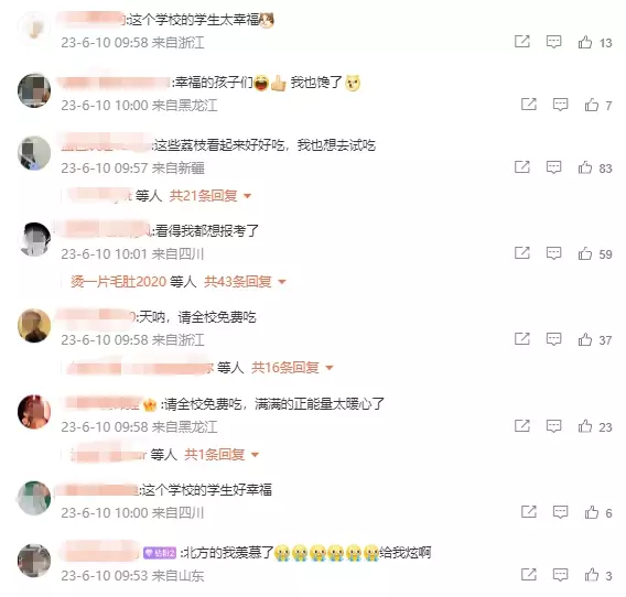 學校派荔枝的小心被放上網後,即惹來全國其他學生羨慕,迅即登上熱搜榜第二位。有人稱:「這是最好的招生簡章,不玩虛的」。