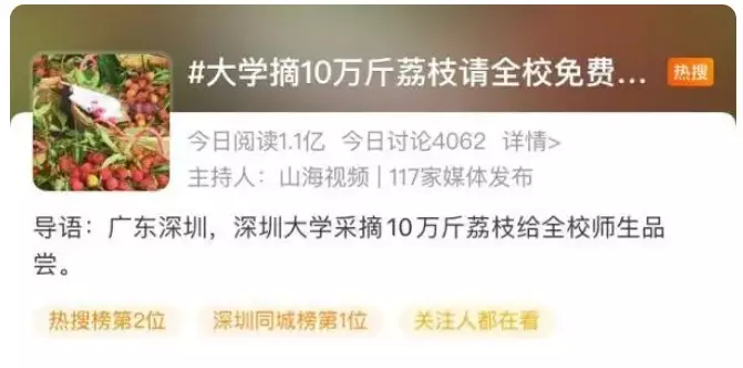 高考剛完畢,接下來就是各大高校招生的時候了。恰逢荔枝收穫的季節,近日在廣東深圳,深圳大學採摘10萬斤荔枝給師生免費品嚐,迅即登上熱搜榜,網民笑說:這是「最有效的招生簡章」。