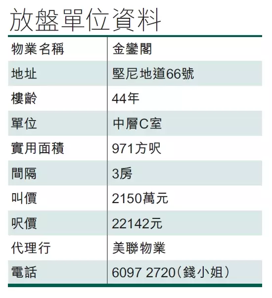 中半山堅尼地道,毗鄰灣仔和金鐘商業區,位處此地段的金鑾閣,自成一隅,環境清幽。 今日介紹該盤中層C室,實用面積971方呎,3房設計,裝修新淨,現連車位叫價2150萬,實用呎價約22142元。