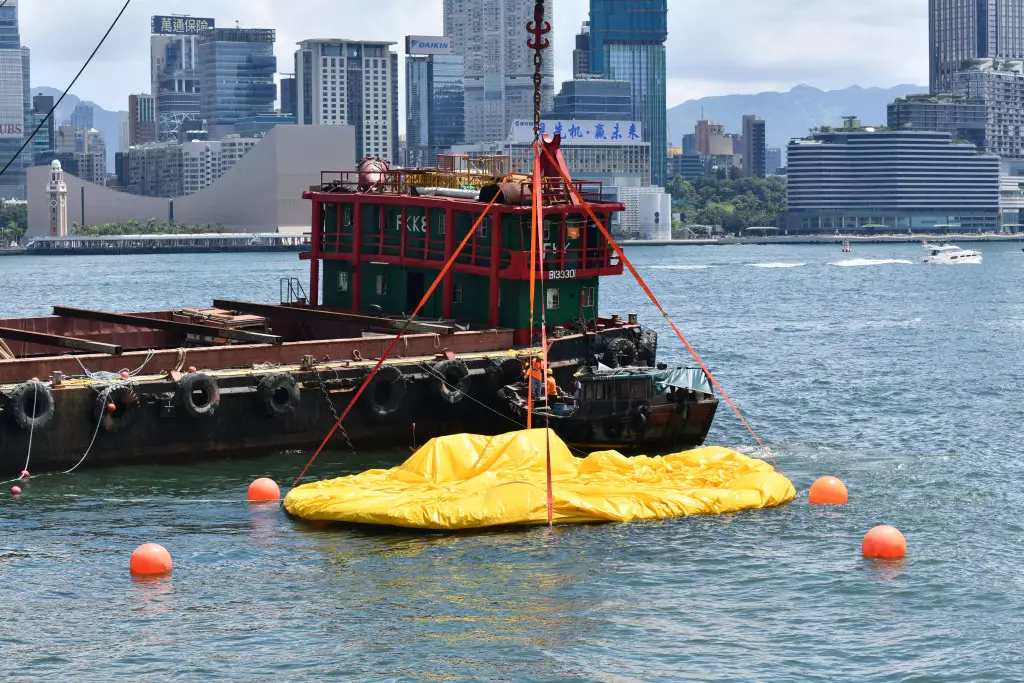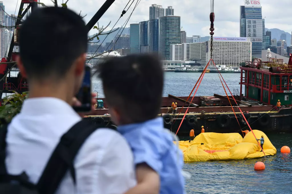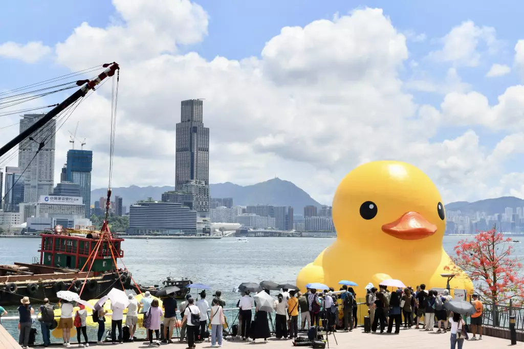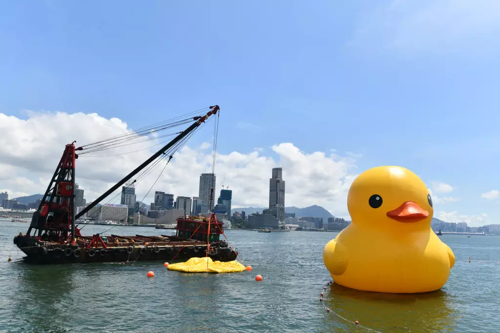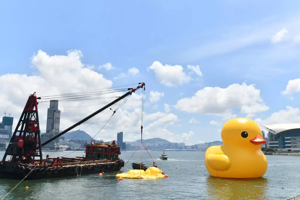 在維港展出的兩隻黃色巨型橡皮鴨,其中一隻前日因天氣太熱要「放氣」,由工作人員綁上纜索、吊上躉船運返青衣船廠修補。橡皮鴨11日在青衣船塢維修後,12日被吊回維港,重新充氣後再次在維港海面展出。