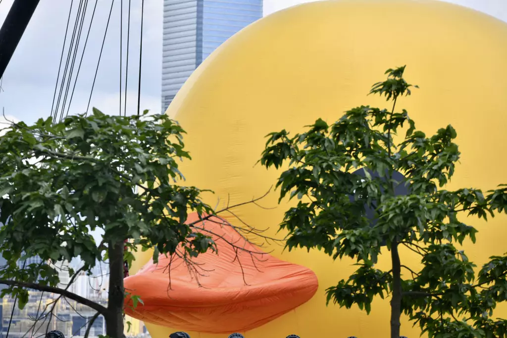 「洩氣」橡皮鴨再次充氣,維港重新展出。