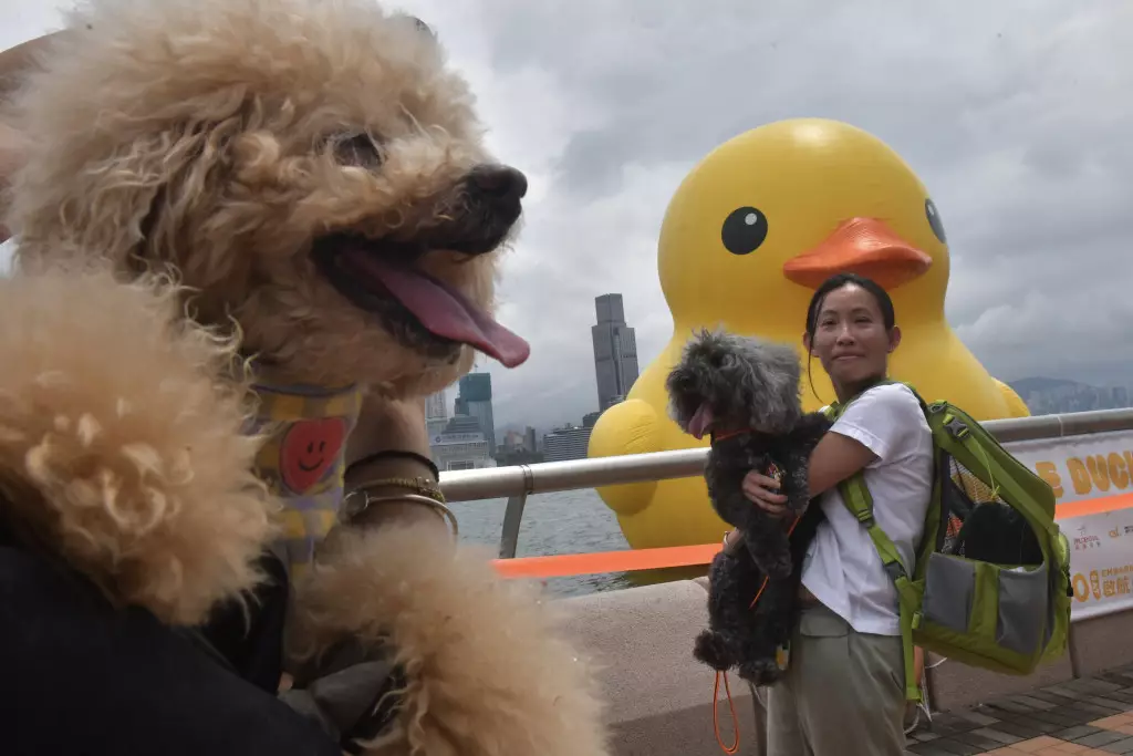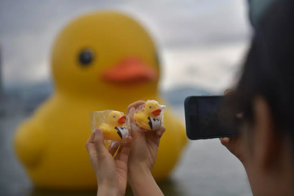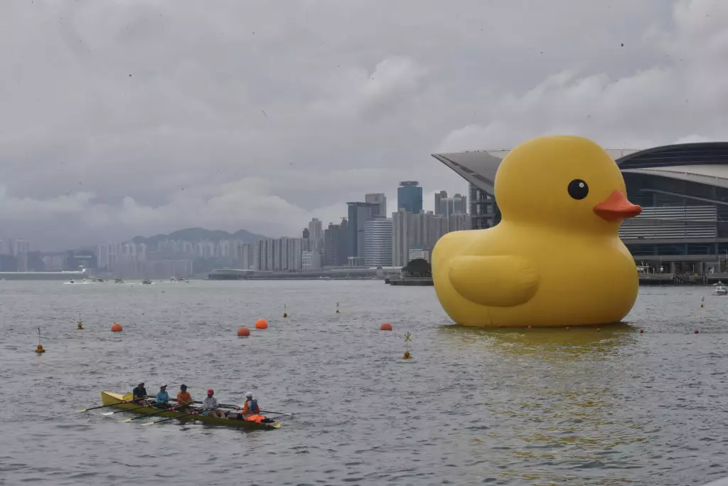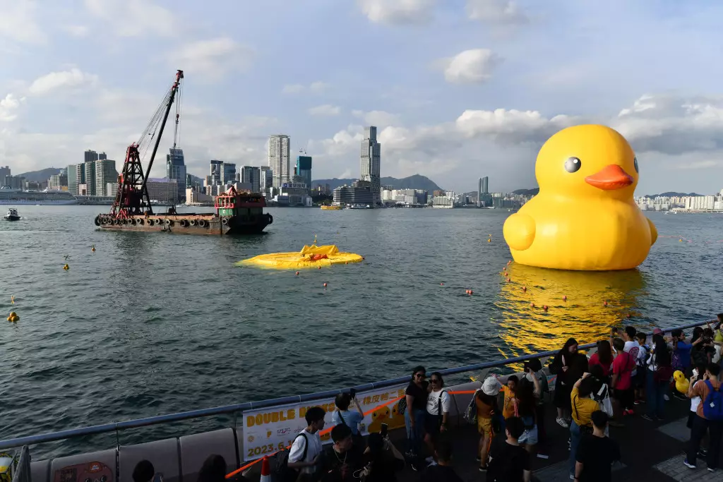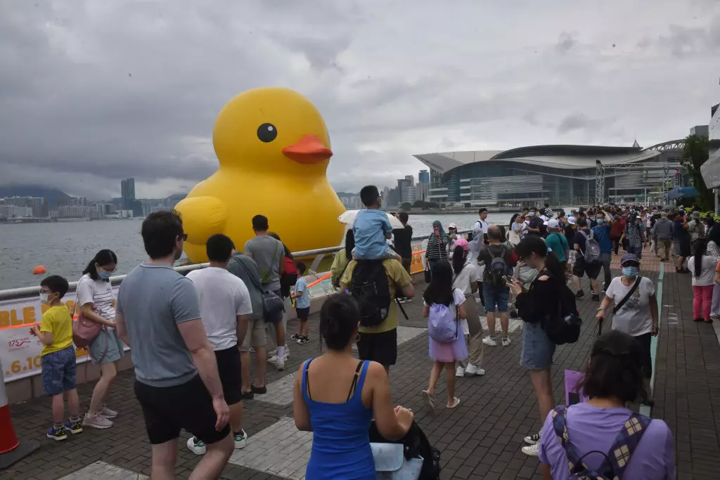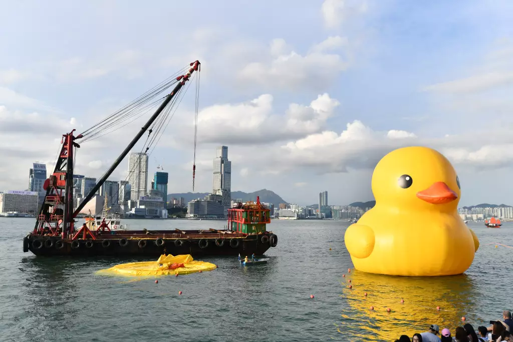 巨型黃色橡皮鴨相隔10年再訪港,由上周六(6月10日)起展開為期2星期的展覽。原本兩隻大鴨成雙成對在金鐘添馬公園對開海域「暢游」,惟正式展出首日(6月10日),其中一隻也疑因為天氣太熱,當日下午1時50分需緊急「放氣」避免谷爆,並運回青衣船廠維修,展出首日即留下另一隻暫時隻影形單。