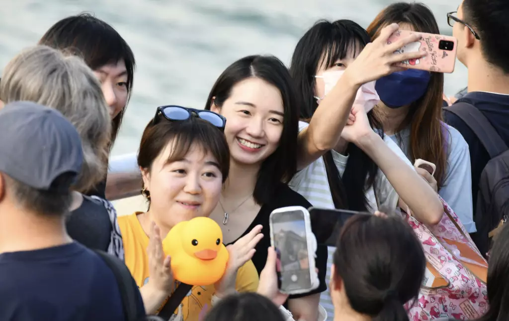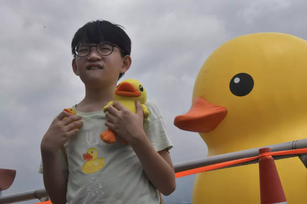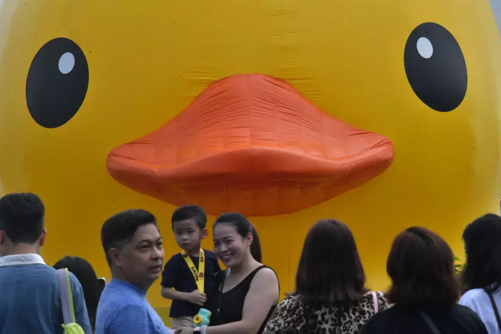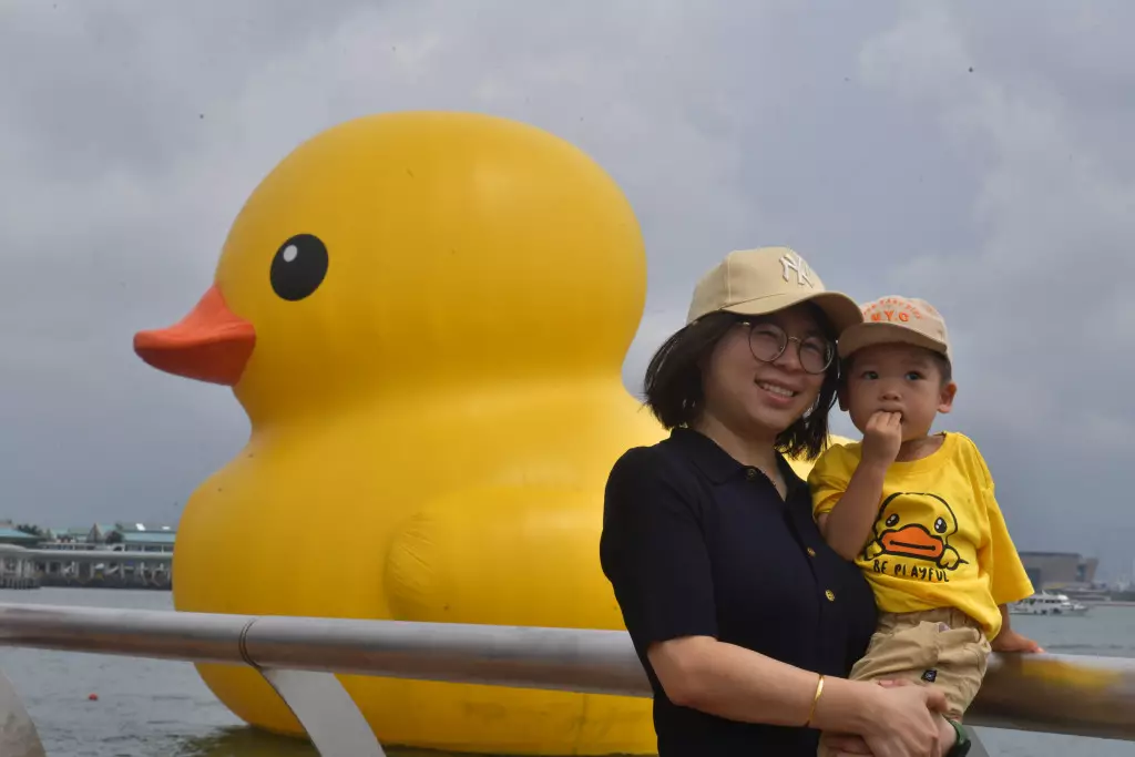 黃色橡皮鴨在維港展出的首個周日,市民與「回復單身」的大鴨打卡。