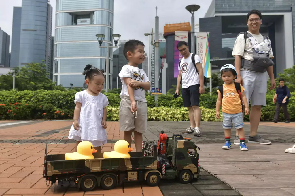 昨日(11日)是展出第2天,即使只有一隻鴨形單影隻,仍無阻市民前去觀賞打卡留念。添馬公園的觀景台大部分時間排起長長隊伍,有不少更是一家大細到來影全家福。