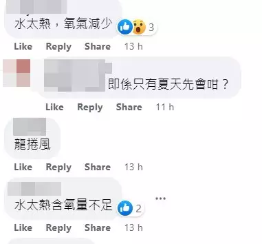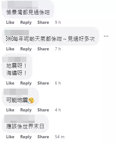 回應的網民初時紛指出可能預示著「地震」、「海嘯」、「天降異象」,並提到日本「北海道6.2級地震多地感受震感」。接著,有人正經地估計,魚躍水面可能與「d水太熱」、「太熱水缺氧」、「可能缺氧」、「水太熱,氧氣減少」、「今日(尖沙嘴)海港城邊都係」、「(大嶼山)愉景灣都見過係咁」、「每年呢啲天氣都係咁~見過好多次」。