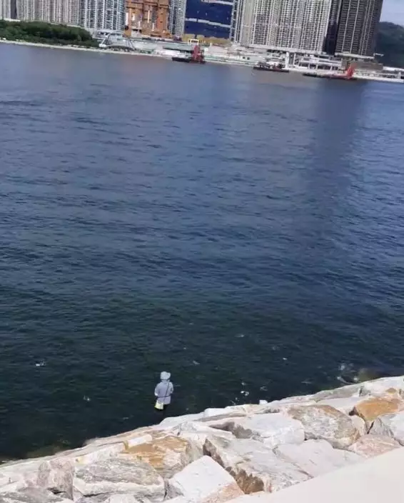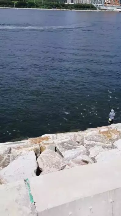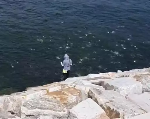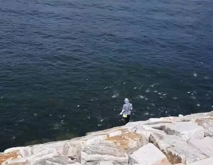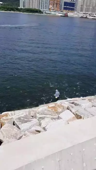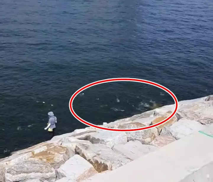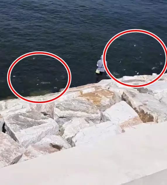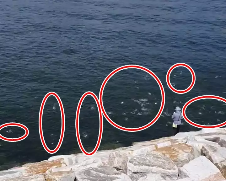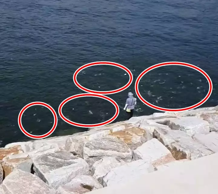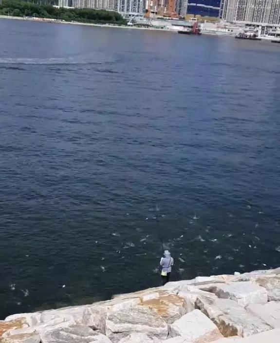 一名懷疑釣客近距離見證群魚亂舞(紅圈示)奇景。網上截圖