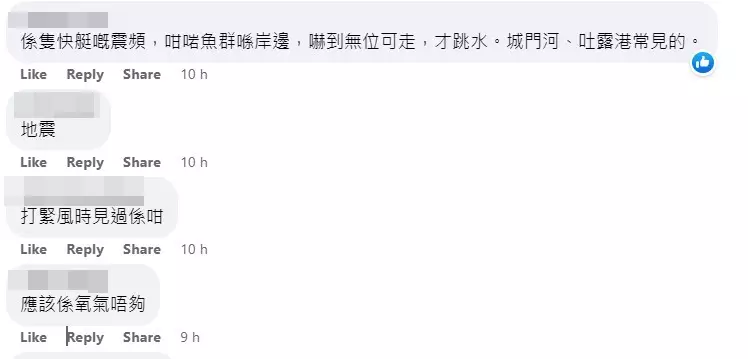 另有人指「(魚)驚都會呀」、「有船經過都會嚇到」、「係隻快艇嘅震頻,咁啱魚群喺岸邊,嚇到無位可走,才跳水。(沙田)城門河、吐露港常見的」。其他網民回應請瀏覽上圖。