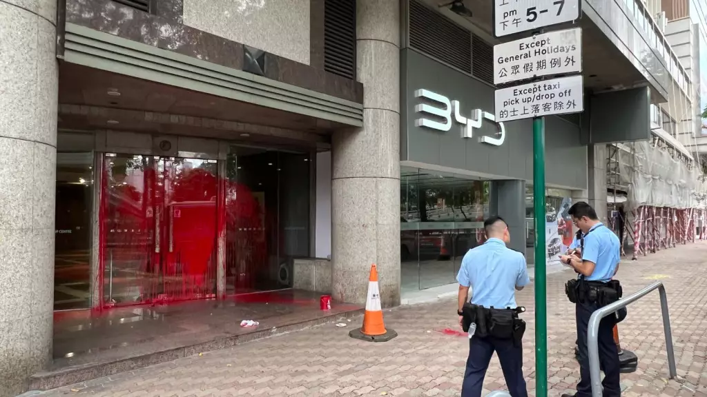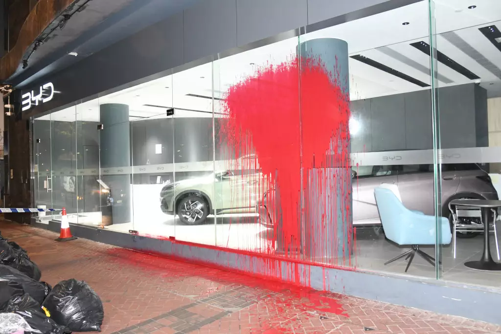 電動車生產商「比亞迪」(BYD)位於港九及新界共4間陳列室與服務中心,12日3小時內遭淋紅油及撞閘等連環破壞,警方經調查後,相信事件牽涉商業糾紛。比亞迪香港總代理聯大汽車12日晚上發聲明,強烈譴責一切擾亂公共秩序的行為,並就事件報警,將配合香港警方進行調查。