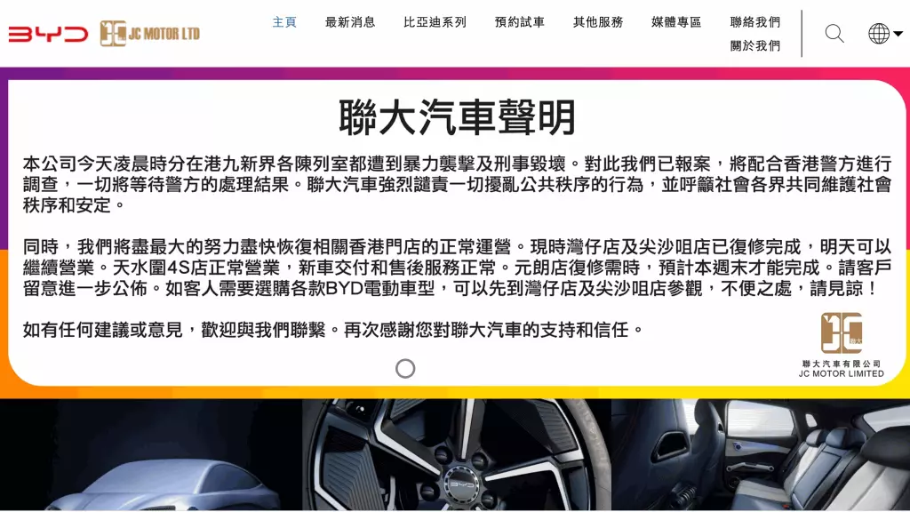 全港4陳列室及服務中心遭刑毀 比亞迪總代理發聲明強烈譴責