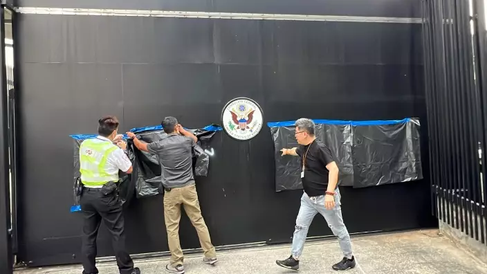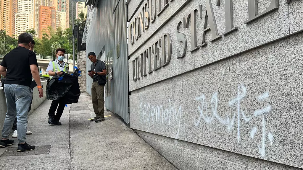 美國領事館遭人用白色漆油塗鴉。13日清晨5時許,警方接獲領事館職員報案,指中環花園道美國領事館懷疑遭人塗鴉。警員接報到場,發現領事館的大閘及外牆懷疑被人用噴上「Hegemony(霸權)」及「双标(雙標)」等字眼。警方其後拘捕一名男子,涉嫌「刑事毀壞」,他被帶返警署接受調查。