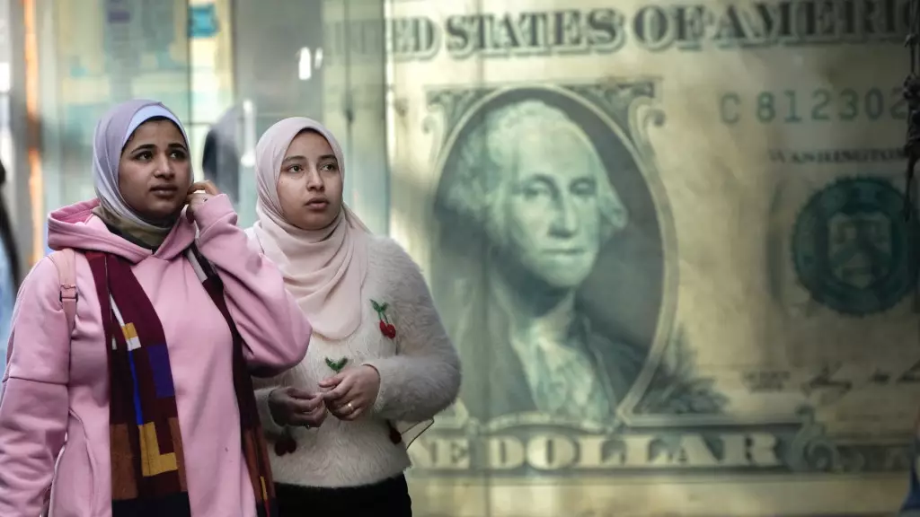 埃及民眾途經一張美元紙幣巨型海報。 美聯社