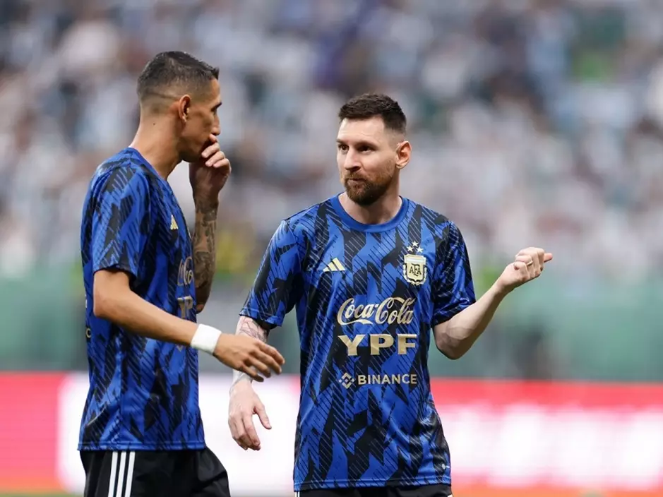 美斯賽前與隊友迪馬利亞傾談。新華社圖片