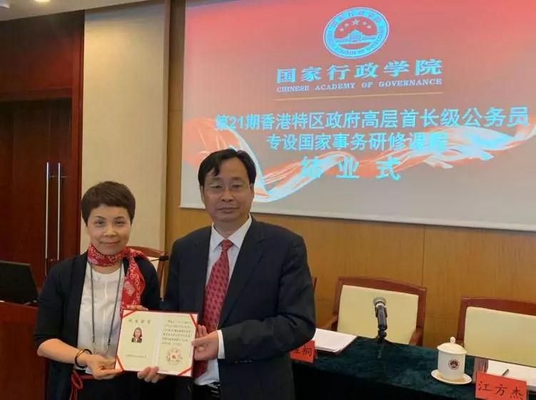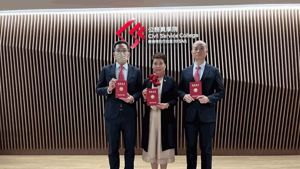 首長級公務員早前參與國家事務研習課程,包括廉署執行處處長(私營機構)蔡樹強(右)、食環衛署副署長(環境衛生)姚繼卓(左)、康文署副署長(文化)譚美兒(中)。