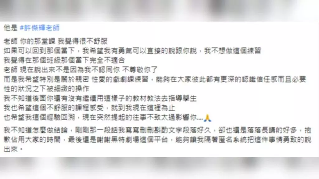 日前有網民以「關於我上過最不舒服的表演課」為題爆料指控有老師要求學員練習「集體做愛」的配音,其後再開名是許傑輝。