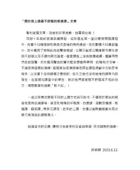 許傑輝曾於facebook發表聲明承認事件,並向當時學生道歉。