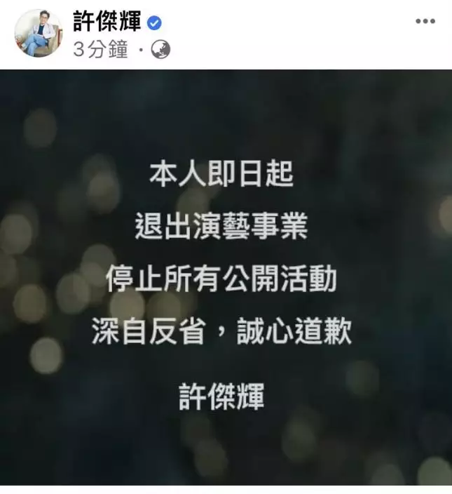 許傑輝遭多名女星指控性騷擾後,宣佈表示退出演藝圈。