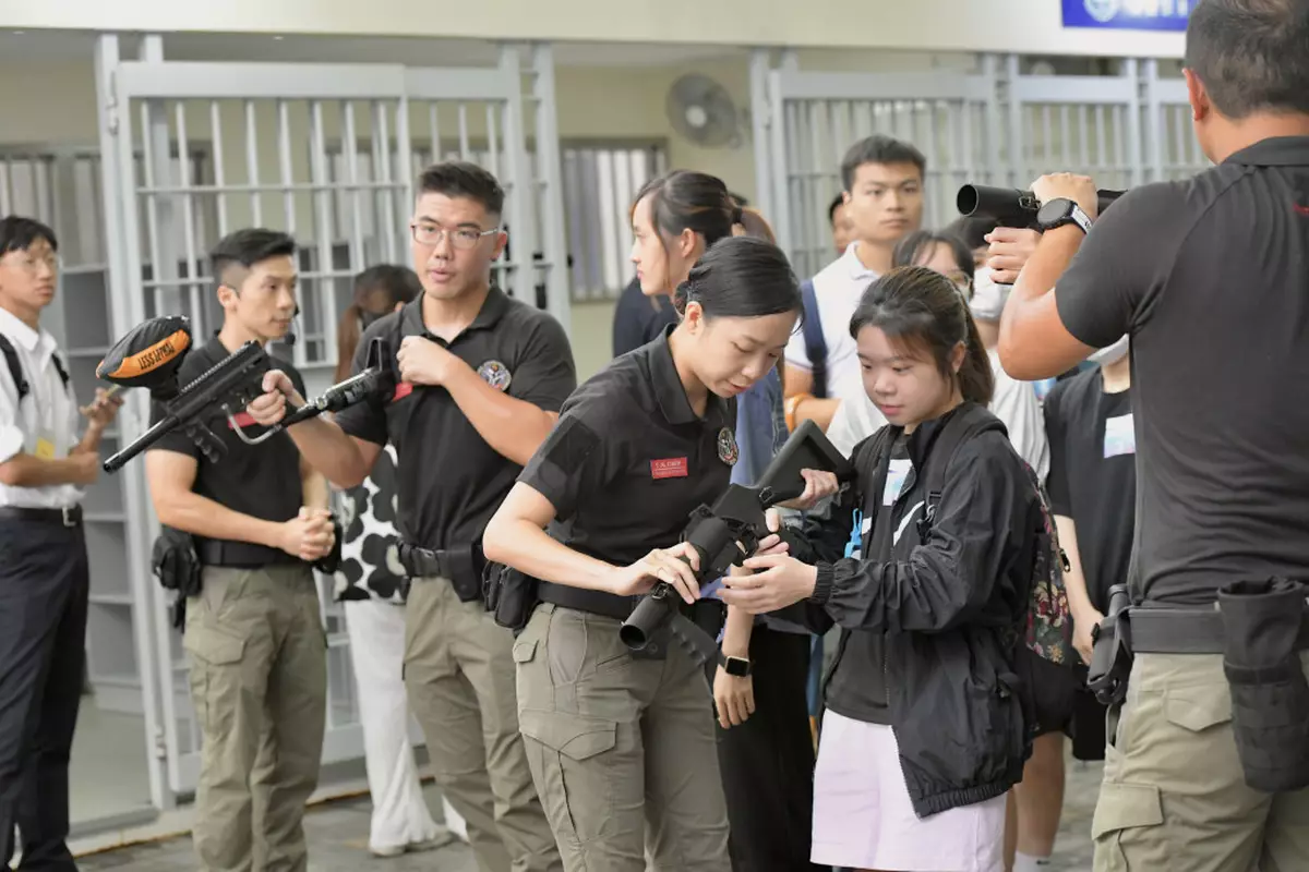 新一輪入境事務主任公開招聘已經在6月15日開始接受報名,截止報名日期為6月28日。今日體驗日現場所見,市民可「落場」親身進行體能測試,例如來回短跑及仰臥起坐等,入境處人員會即席「指點」參與的市民動作是否標準。戰術訓練的攤位亦展示不同槍械、盾牌、胡椒噴霧等裝備,市民可親自手持盾牌「招架」,一嚐運用戰術的感受,不少市民圍着該攤位參觀,甚為熱鬧。