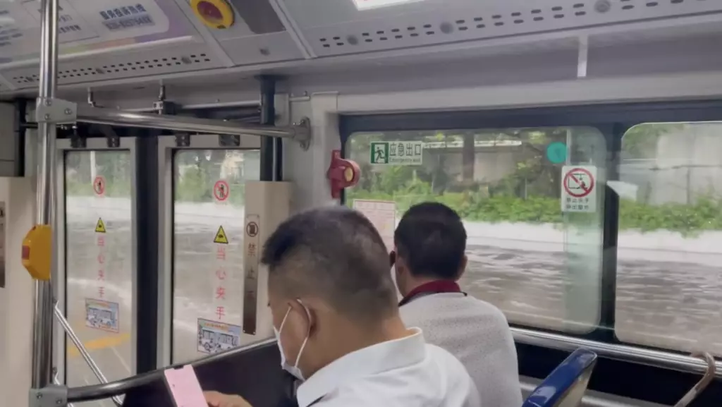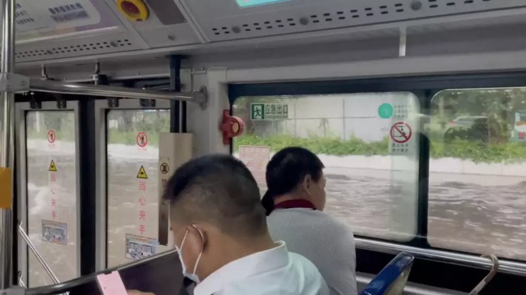 只見影片中,本來是在馬路上行駛的巴士搖身一變,變成一艘「渡輪」,只見窗外還在稀稀疏疏地下著雨,但巴士仍無懼險阻,在「河中」勇往直前,車上乘客也陷入一片焦灼中,紛紛在發訊息,疑似在向公司上司報備需要遲到或者請假。