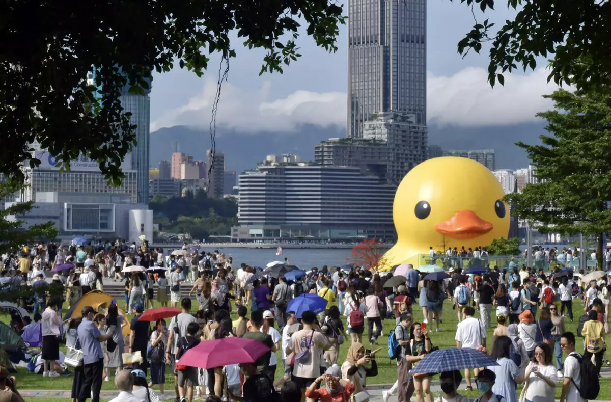 黃鴨暢遊維港,市民夾岸歡送。