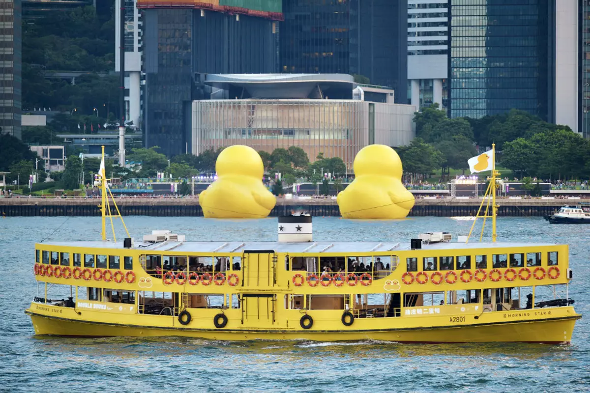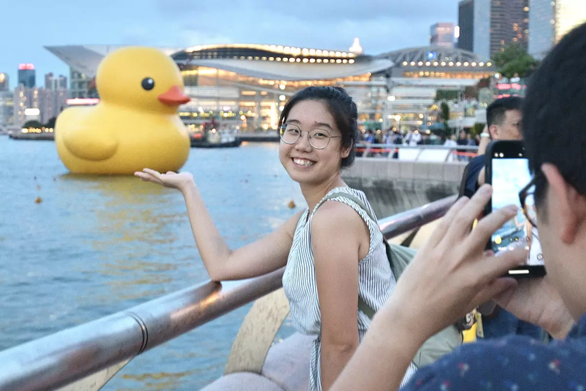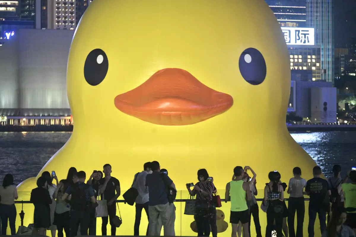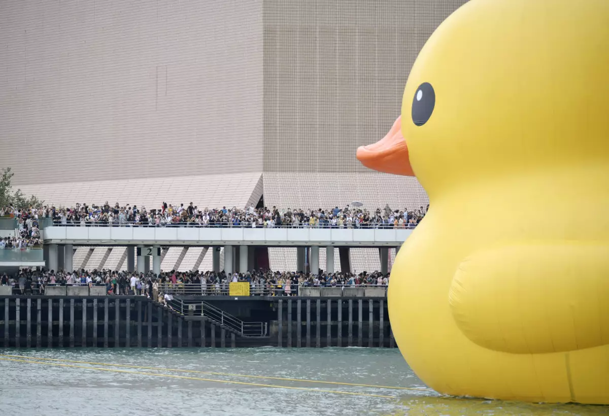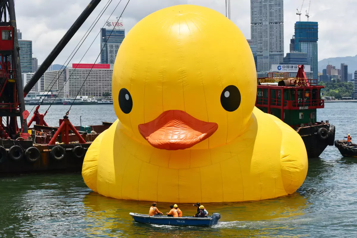 一對黃色巨鴨在維港正式開放首日,其中一隻鴨突然漏氣變成鴨皮,幸而很快再充氣,脹卜卜重現市民面前,不許另一隻巨鴨形單隻影。