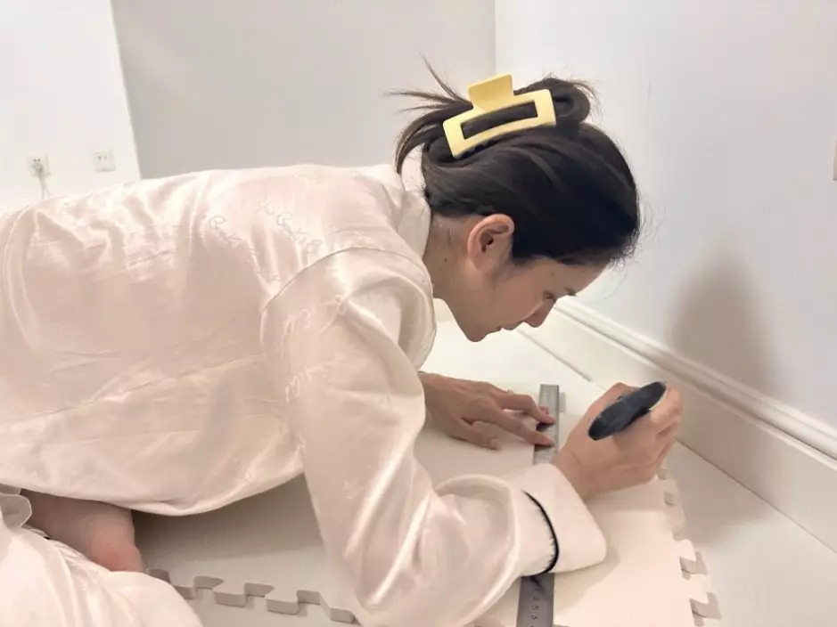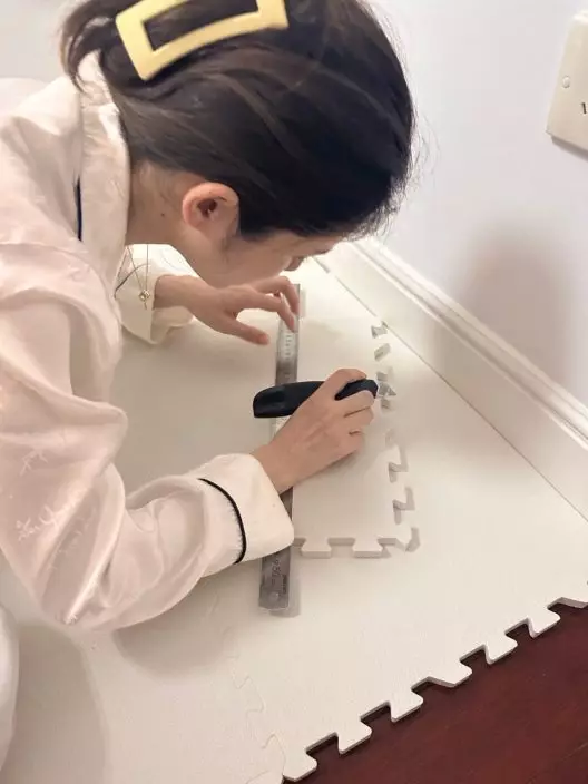 張馨月親力親為鋪地墊。