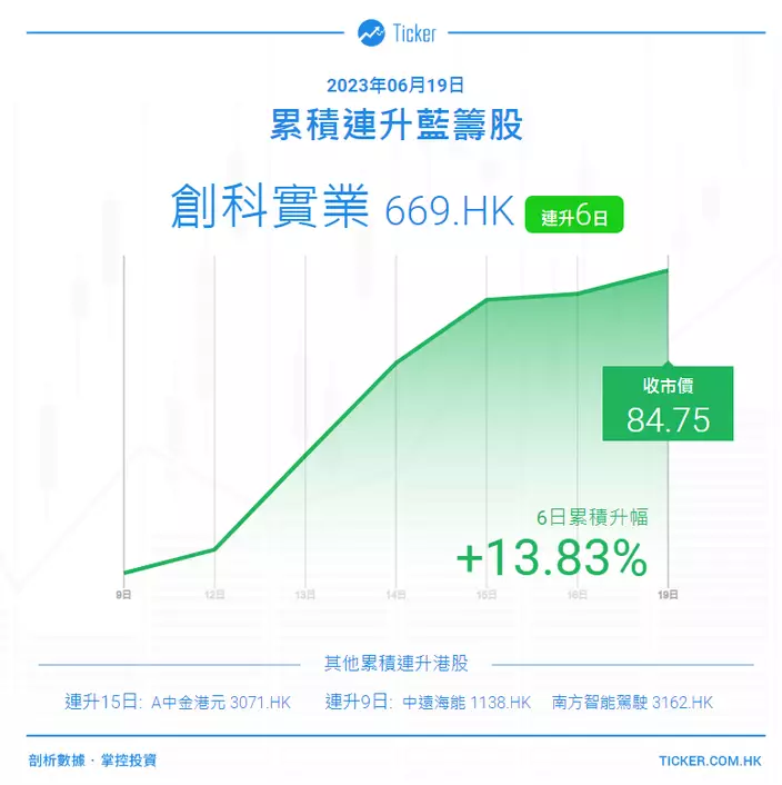 創科實業(00669)連升6日,累升13.83%,今日升0.95%,收報84.75元,成交額1.26億元。