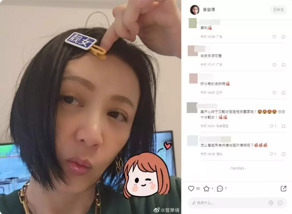 曾華倩今日發佈的照片,只見她夾上寫有「靚女」的髮夾,並笑指:「哈哈……自己給自己打打氣吧!」網民都讚她靚女又可愛,甚至有人指她「看上去才30歲」,不過卻有網民留言:「怎麼看起來有點像桃姐葉德嫻呢?」現實中葉德嫻已年屆75歲,與57歲的曾華倩相差18年,即使拍攝《桃姐》時為2011年,葉德嫻當時也已63歲,或因兩人都眼大大而被認錯。
