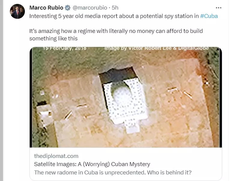 2018年衛星圖像顯示,古巴貝胡卡爾附近的訊號情報基地新蓋了天線罩。 Marco Rubio Twitter
