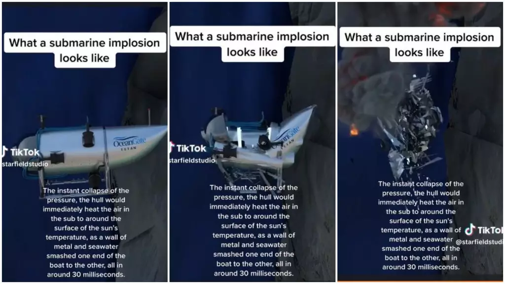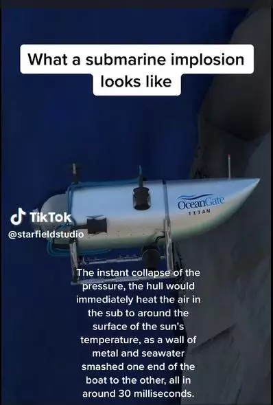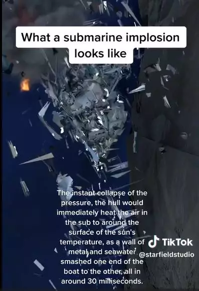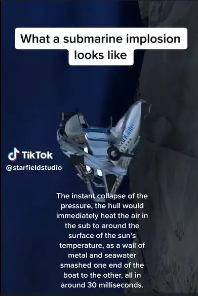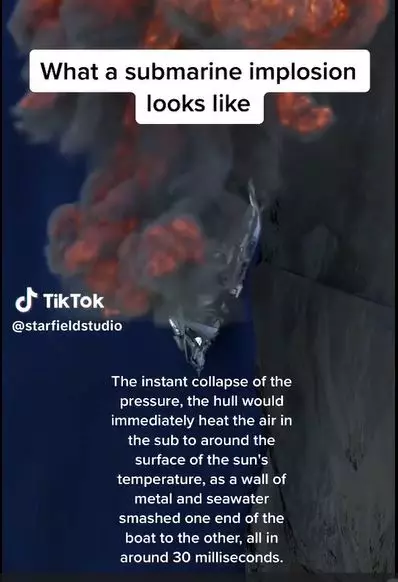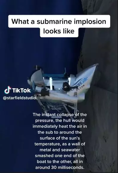 根據Tiktok另外一名用戶@starfieldstudio發布的另一段影片,泰坦號正在向海底下沉,接著開始像被踩踏的鐵罐一樣碎裂,內爆後金屬炸裂,未留下一絲痕跡。和海水將船的一端撞向另一端時,船體會立即將潛水器中的空氣加熱到太陽表面的溫度,這一切都在約30毫秒內完成。」