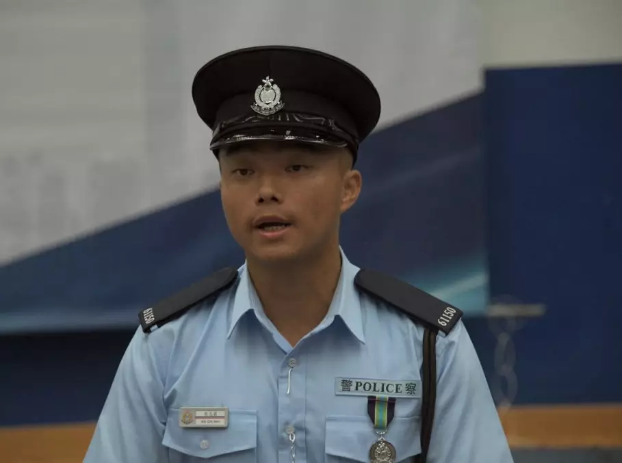 香港警察學院畢業會操24日舉行,今屆學期共110名畢業警員以及32名畢業督察,其中23歲譚鈞鎧榮膺最佳結業督察,27歲吳志霖為最佳結業學警和最優秀結業警員。來自警察世家的譚鈞鎧,自幼受父親的警察故事薰陶,立志成為除暴安良的好警察。