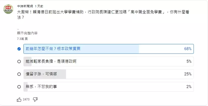 台灣「中時新聞網」YouTube頻道22日起針對「大撒幣!賴清德日前拋出大學學費補助,陳建仁更加碼『高中職全面免學費』,你有什麼看法?」進行網絡民調,截至23日晚上7點,已有7.3萬名網友投票。68%的網友認為「前幾年怎麼不做?根本政策買票」;5%網友表示「能減輕家長負擔,是項德政」;25%則認為「債留子孫,可憐哪」;2%「無感,不關我的事」。
