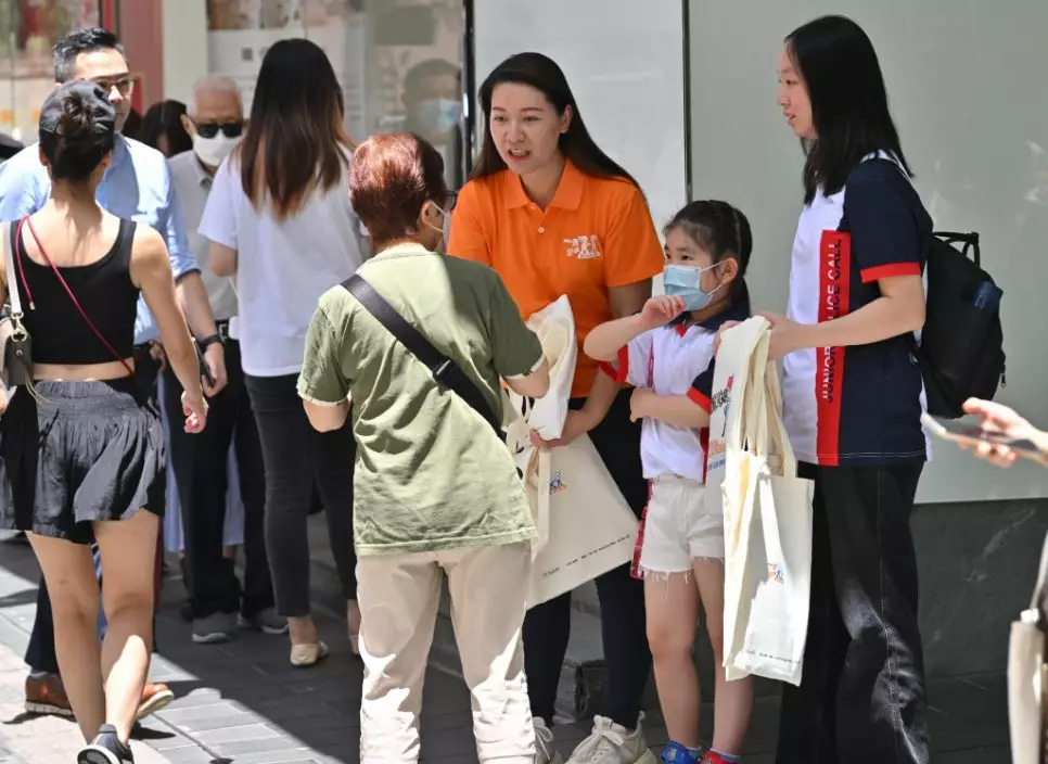 少年警訊成員(右一及右二)向市民派發禁毒單張和宣傳品。政府新聞處